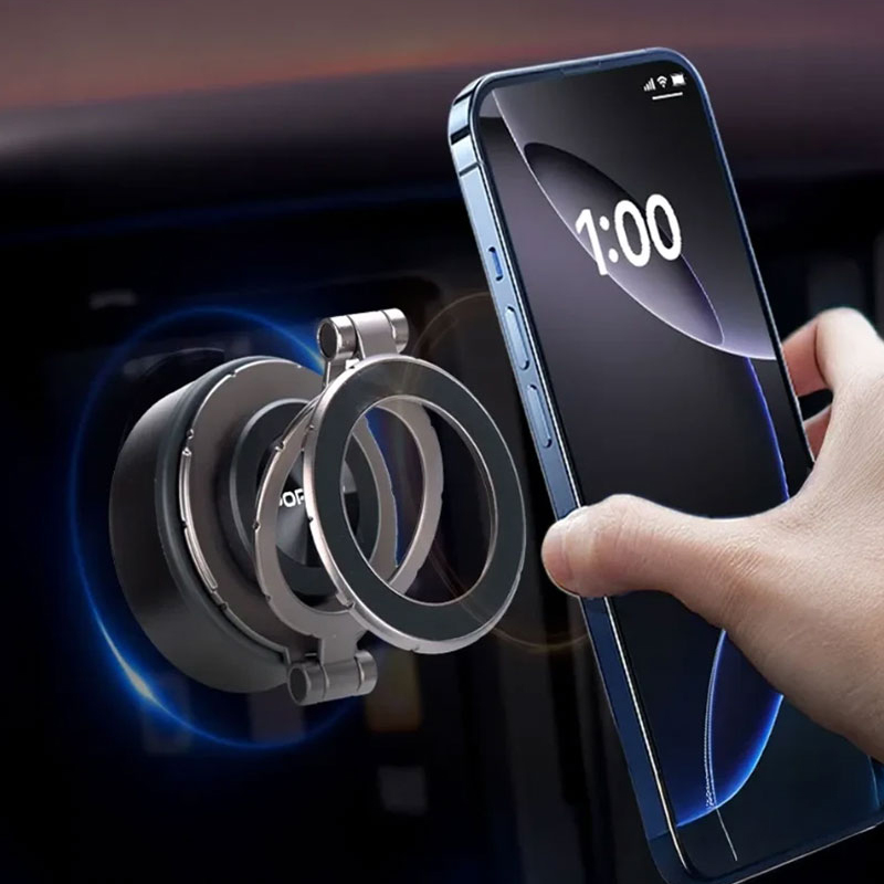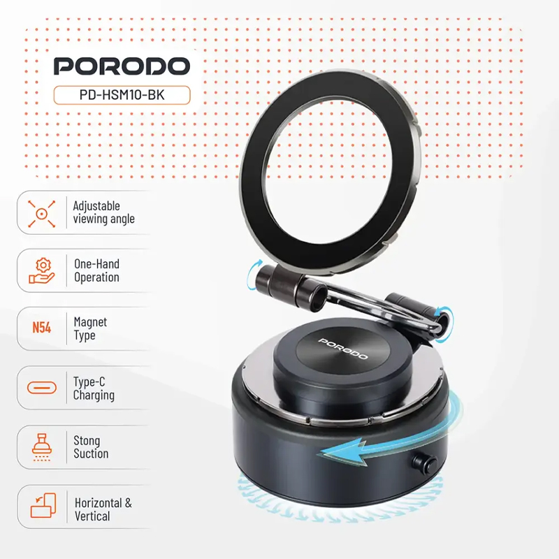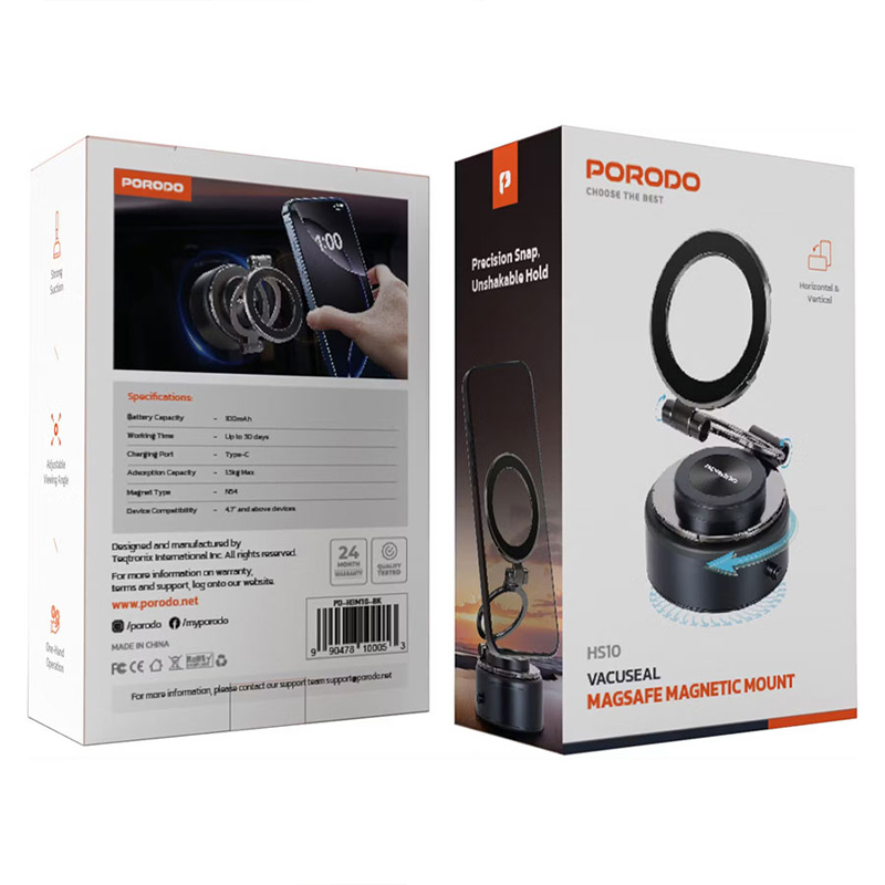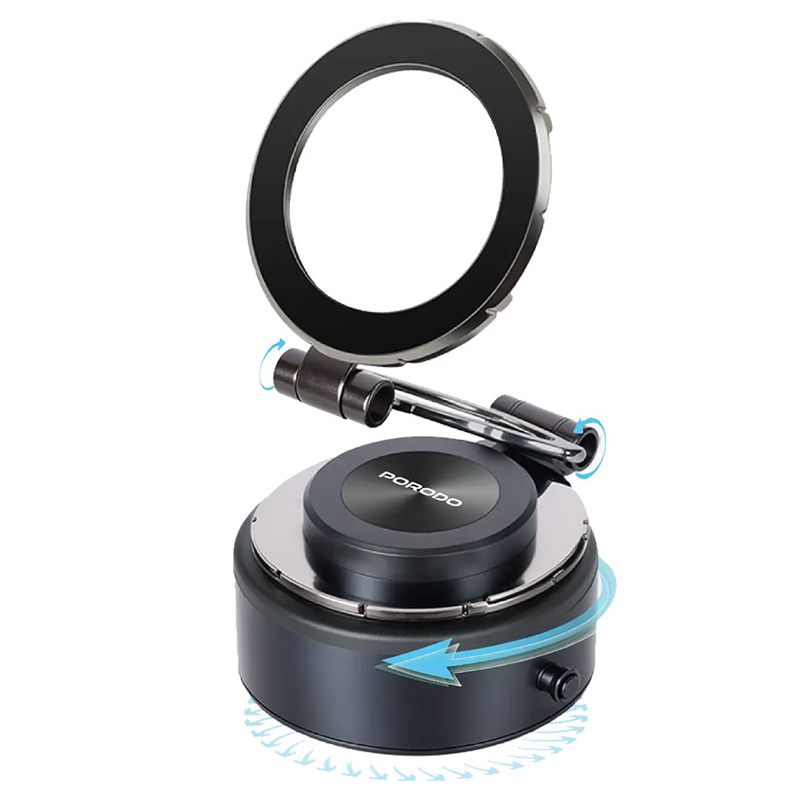 ایه مغناطیسی Porodo Vacuseal MagSafe یک نگهدارنده گوشی همه کاره و قدرتمند است که برای نصب ایمن و راحتی بدون دخالت دست طراحی شده است. این دستگاه مجهز به آهنرباهای قوی N54 است و با ظرفیت جذب تا ۱.۵ کیلوگرم، چسبندگی محکمی را فراهم میکند و پایداری دستگاههای ۴.۷ اینچی و بالاتر را تضمین میکند. این دستگاه دارای یک باتری داخلی ۱۰۰ میلیآمپر ساعتی است که تا ۳۰ روز کار میکند و از طریق پورت Type-C برای شارژ سریع و آسان شارژ میشود. این پایه که برای کار با یک دست طراحی شده است، نصب و جداسازی آسان را امکانپذیر میکند. با داشتن زاویه دید قابل تنظیم، از جهتگیری افقی و عمودی نیز پشتیبانی میکند که برای ناوبری، تماسهای ویدیویی یا پخش آنلاین عالی است. طراحی براق و بادوام آن، مکش قوی را تضمین میکند و در عین حال زیبایی مینیمالیستی را برای هر فضای کاری یا وسیله نقلیه حفظ میکند.