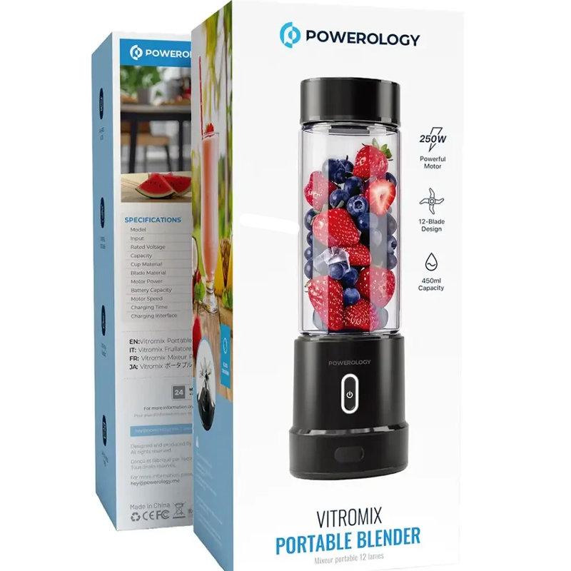 محصول **Powerology Vitromix Portable Blender** یک مخلوطکن قابل حمل است که برای تهیه اسموتیها، آبمیوهها و مخلوطهای مختلف بهصورت سریع و در هر مکان طراحی شده است.