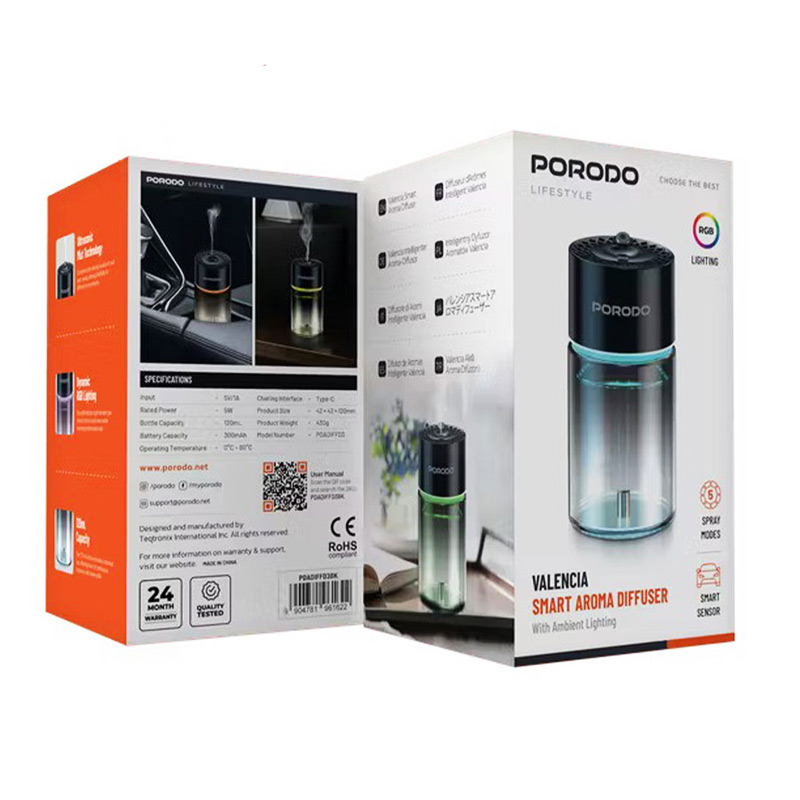با نصب دستگاه پخشکننده عطر هوشمند Porodo Lifestyle Valencia، هر فضایی با هالهای از زیبایی و آرامش مزین خواهد شد. این دستگاه شیک و زیبا، دارای ظرفیت بطری ۱۲۰ میلیلیتر و فناوری مه اولتراسونیک است تا فضا را دلپذیر و آرام نگه دارد. این دستگاه با توان ۵ وات (ورودی ۵ ولت/۱ آمپر) و باتری ۳۰۰ میلیآمپرساعتی کار میکند و میتوان آن را با خود حمل کرد. نورپردازی RGB پر جنب و جوش به هر فضایی رنگ میبخشد و حسگر هوشمند آن کارایی را حفظ میکند. پنج حالت اسپری وجود دارد که به شما امکان میدهد سطح خروجی مه را به دلخواه خود انتخاب کنید. شارژ از طریق رابط Type-C انجام میشود و امکان شارژ سریع و آسان را فراهم میکند. دستگاه پخشکننده عطر هوشمند Porodo Lifestyle Valencia یک مولد عالی برای ایجاد رایحهای دلپذیر از ۰ تا ۶۰ درجه سانتیگراد است: چه در خانه و چه در دفتر.